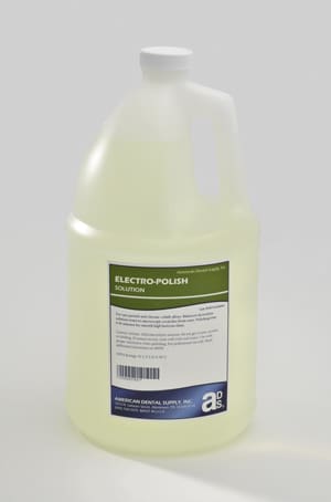 Product Description: Balanced electrolytic solution for final polishing of the cast to the finish you desire. Removes microscopic scratches and burs from tissue area of casts. Reduces food retention and corrosion in patients mouth. Eliminates need for additional mechanical polishing after preliminary finishing procedures. Polishing time averages 6-10 minutes to achieve a smooth, high lustrous shine. Features: Electrolytic solution for polishing Average polishing time: 6-10 mins Volume: 1 gallon Quantity: 1pk Size: 1 gal