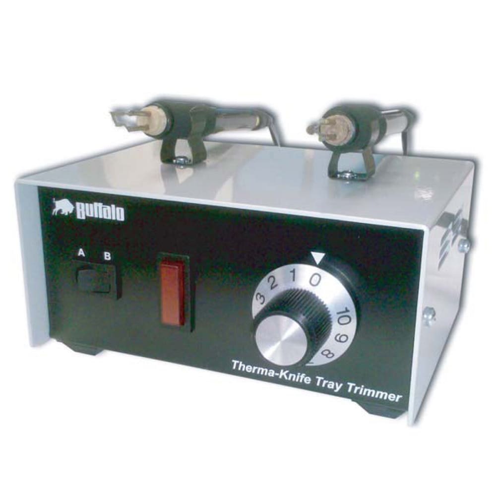 Product Description: The Buffalo ThermaKnife Hot Tipped Tray Trimming Knife is an effective and time-saving knife for fast and easy trimming of bleaching trays, night guards, mouthguards and other thermoplastic materials. Featuring an A and B switch, the ThermaKnife has the ability to support two different pens at one time or support a pen and our newly available ThermaPlier. This allows the user to quickly switch back and forth on a trimming job for efficiency and accuracy. Simply choose the pen design that best suits your needs, set your temperature and complete your trimming job with ease. With an adjustable temperature control, youll always be able to customize the process to your cutting speed and material thickness. Pens and plier can also be interchanged quickly and easily. A & B Selection switch allows for the use of two different Pens or a Pen and ThermaPlier to reduce time and increase trimming productivity. Lightweight pen features an ergonomic design and sharp, permanent tip for improved comfort & control. Convenient pen rest provides added safety when unit not in use. Features: Trimmer for thermoplastic materials with fully adjustable temperature control for precise cutting action Cutting tip heats ultra-fast to save time and eliminate waiting Fast and easy pen replacement via snap connector at back of pen for added convenience Size: Console 5.75 W x 5 D x 4 H (incl. pen rest) Pen: 6 L x .75 W (at foam grip), 2.5 lb total console/pen weight A & B Selection switch allows for the use of two different Pens or a Pen and ThermaPlier to reduce time and increase trimming productivity Quantity: 1pk
