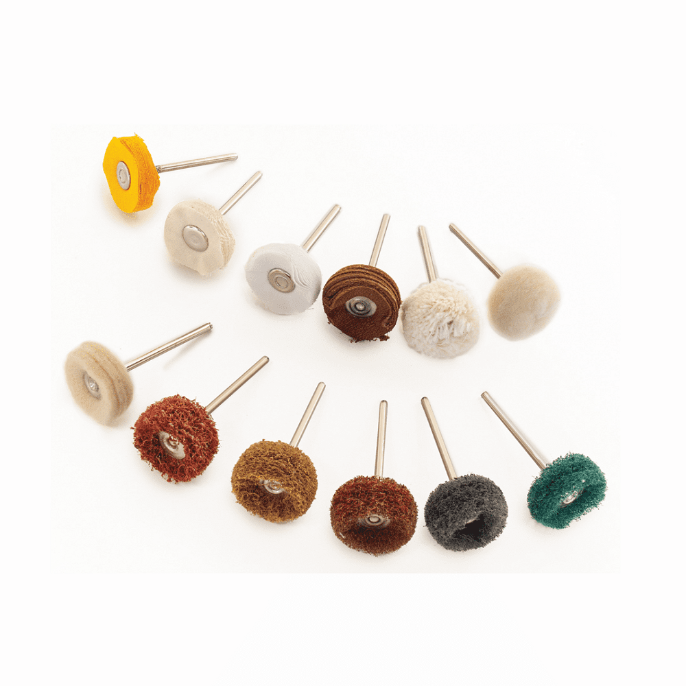 Product Description: Set of twelve assorted mounted polishers for every purpose. Satin Finishers have nylon heads impregnated with various abrasive grits for cleaning and obtaining matte finishes on metal or plastic. Felt and cotton buffs are used for buffing and polishing with compounds on hard and soft metals, metal plate, precious metals, plastics, wood, acrylic, and painted surfaces. Features: Set of 12 mounted polishers Shank: 2.35mm HP Material: Nylon Diameter: 22mm (.866″) Max Speed: 10,000 rpm Quantity: 12pk Size: 22mm