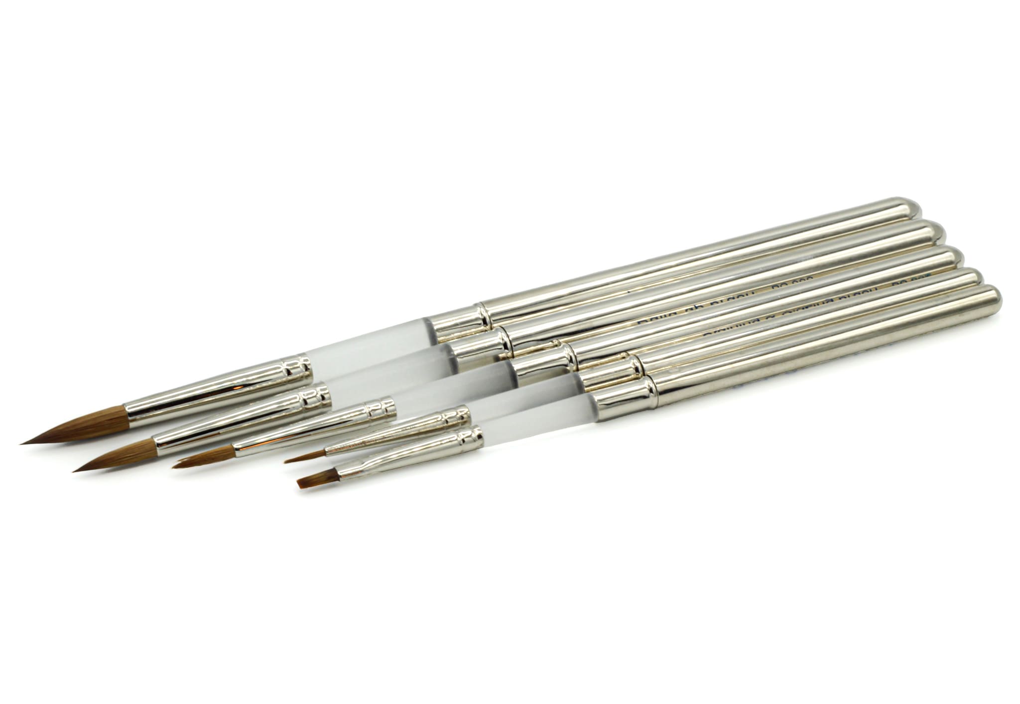 Product Description: Natural hair brush with caps and a removable handle. Sold individually or in a set of 5. Aesthetically pleasing, lightweight, and comfortable to use. Features: #1R – Round for Staining & Glazing #3R – Round for Build-Up #5R – Round for Build-Up #6R – Round for Build-up #4F – Flat for Paste