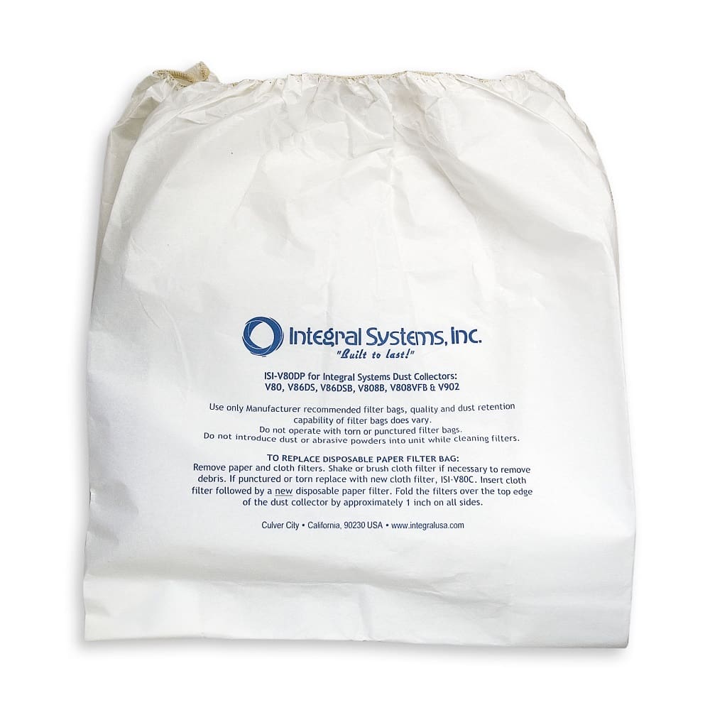 Product Description: High efficiency disposable filter bag, replacement for the ISI-V80DP and ISI-V80C dust collectors from Integral Systems Inc. Fits all dust collector models except for models specific to zirconium collection, EON, and ZVAC. Features: High efficiency disposable filter bag Pack of 3 replacement bags Quantity: 3pk