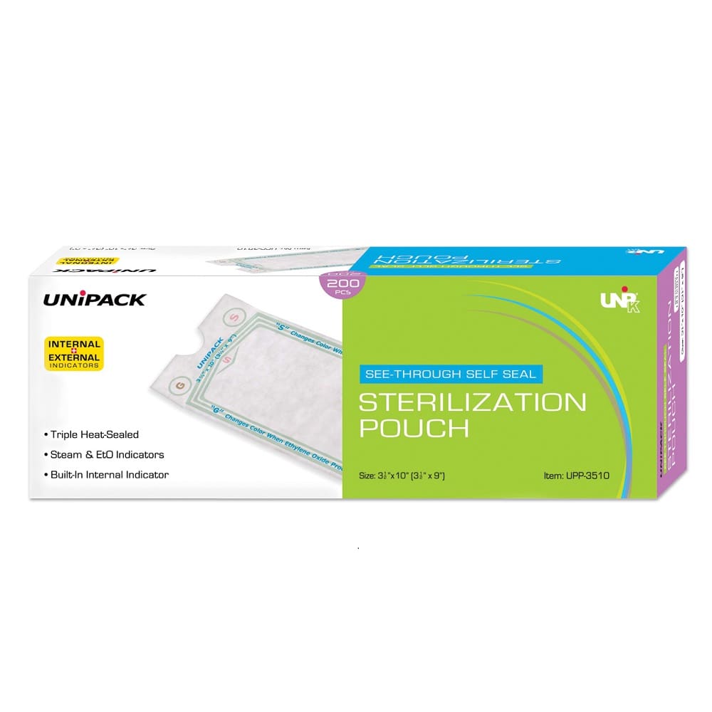 Product Description: Blue-tinted see-through, self-seal pouches printed with two external color-changing indicators one for steam (autoclave) process and the other for ethylene oxide (EtO gas) process. Each pouch also includes a built-in internal indicator for steam process, as recommended by the CDC. Perforated easy-seal flap with ” wide adhesive strip. Strong triple seal eliminates shattering and tearing. Produced with lead-free inks. Features: See-through, self-seal pouches for sterilization Two external color changing indicators for steam and ethylene oxide processes Built in internal indicator for steam process as per CDC recommendations Size: 3.5x10in Triple seal to eliminate shattering and tearing Quantity: 1000pk Size: 3.5x10in